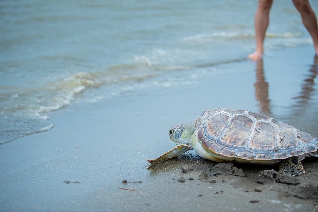 此次野放的海龜是由大園區黃金海岸巡護隊去年11月在淨灘時發現一隻奄奄一息的小綠蠵龜(小名BOSS),前肢及頭部都有明顯傷痕,經緊急後送至臺灣海洋大學發現有嚴重脫水與發炎現象,經過專業團隊7個月的細心照護後,不但恢復健康、體重也變重了,相當有活力!經評估後已達到野放標準,因此特別安排於觀音白玉沙灘進行野放作業,在眾人的加油中,小海龜奮力向前,順利地重返大海。