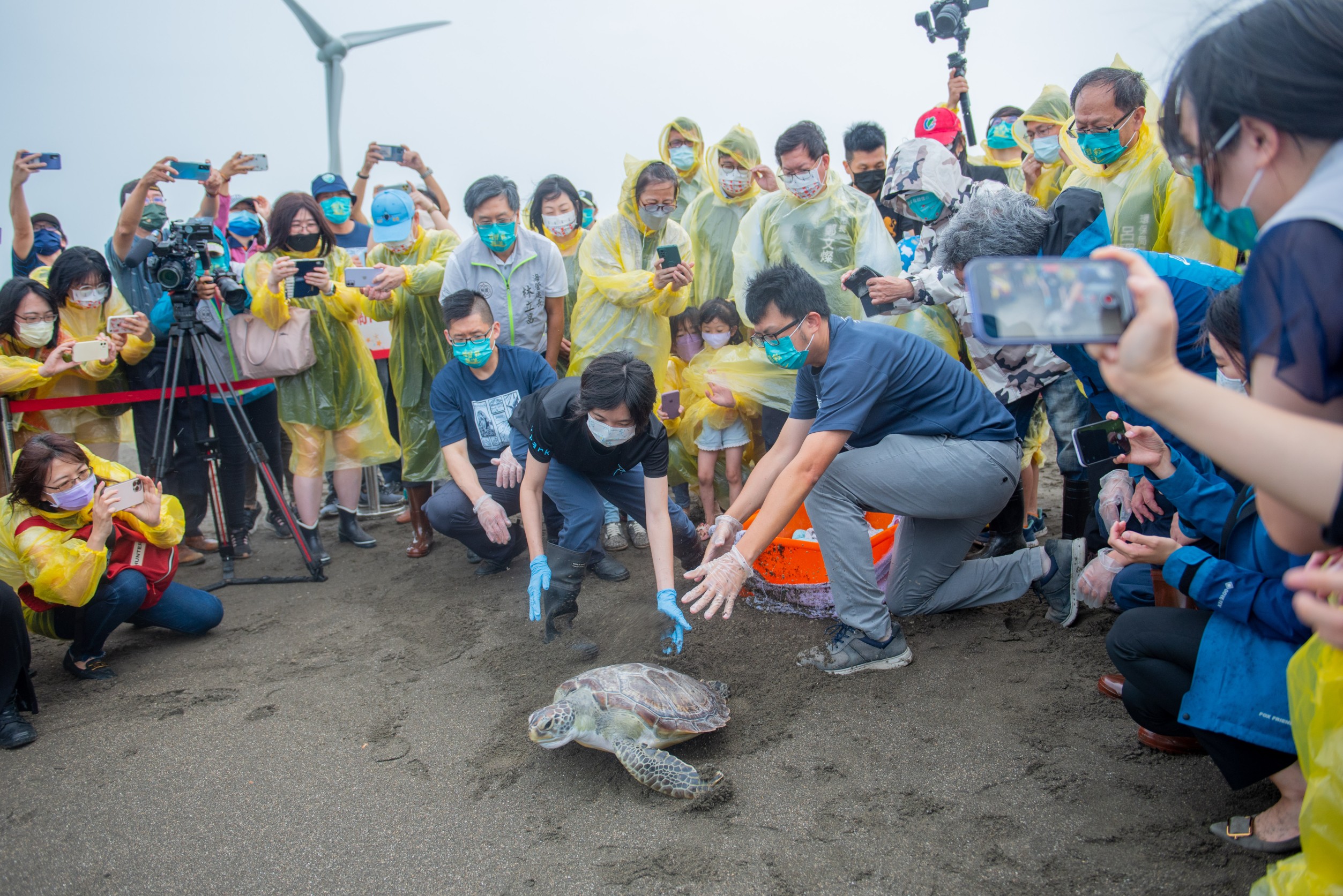 此次野放的海龜是由大園區黃金海岸巡護隊去年11月在淨灘時發現一隻奄奄一息的小綠蠵龜(小名BOSS),前肢及頭部都有明顯傷痕,經緊急後送至臺灣海洋大學發現有嚴重脫水與發炎現象,經過專業團隊7個月的細心照護後,不但恢復健康、體重也變重了,相當有活力!經評估後已達到野放標準,因此特別安排於觀音白玉沙灘進行野放作業,在眾人的加油中,小海龜奮力向前,順利地重返大海。