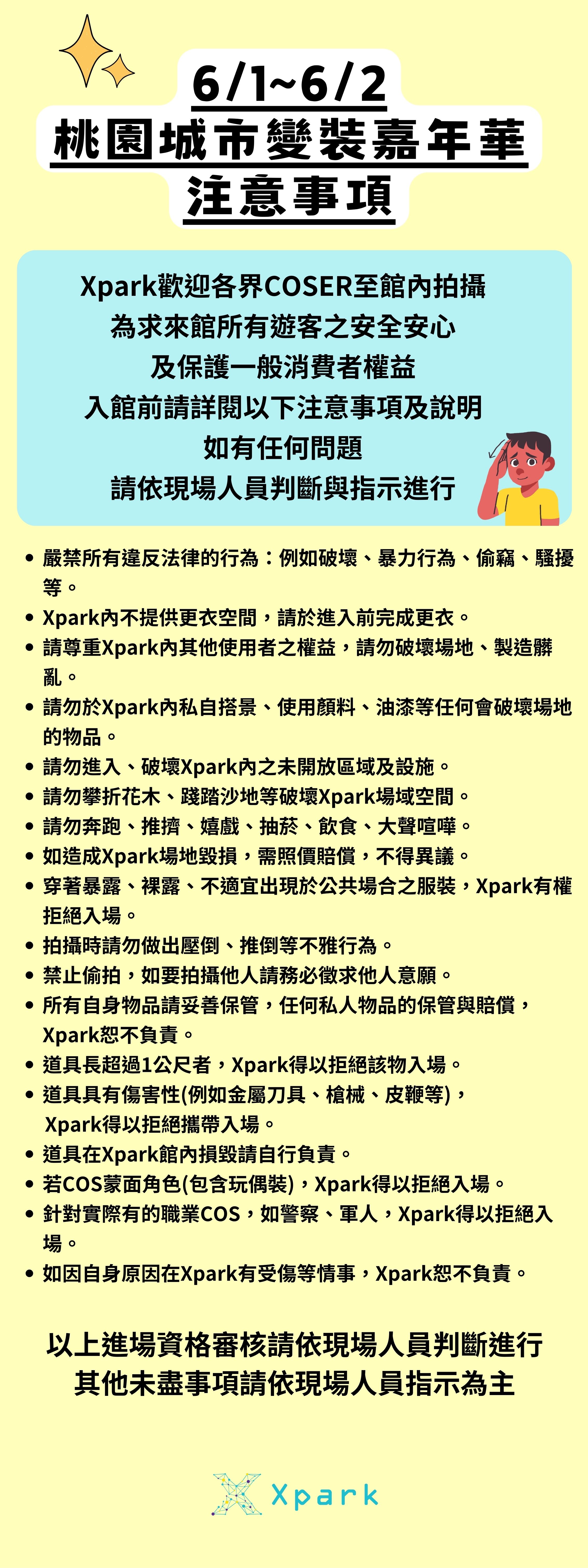 Xpark溫馨提醒您,請務必、務必、務必遵守以下入館注意事項。