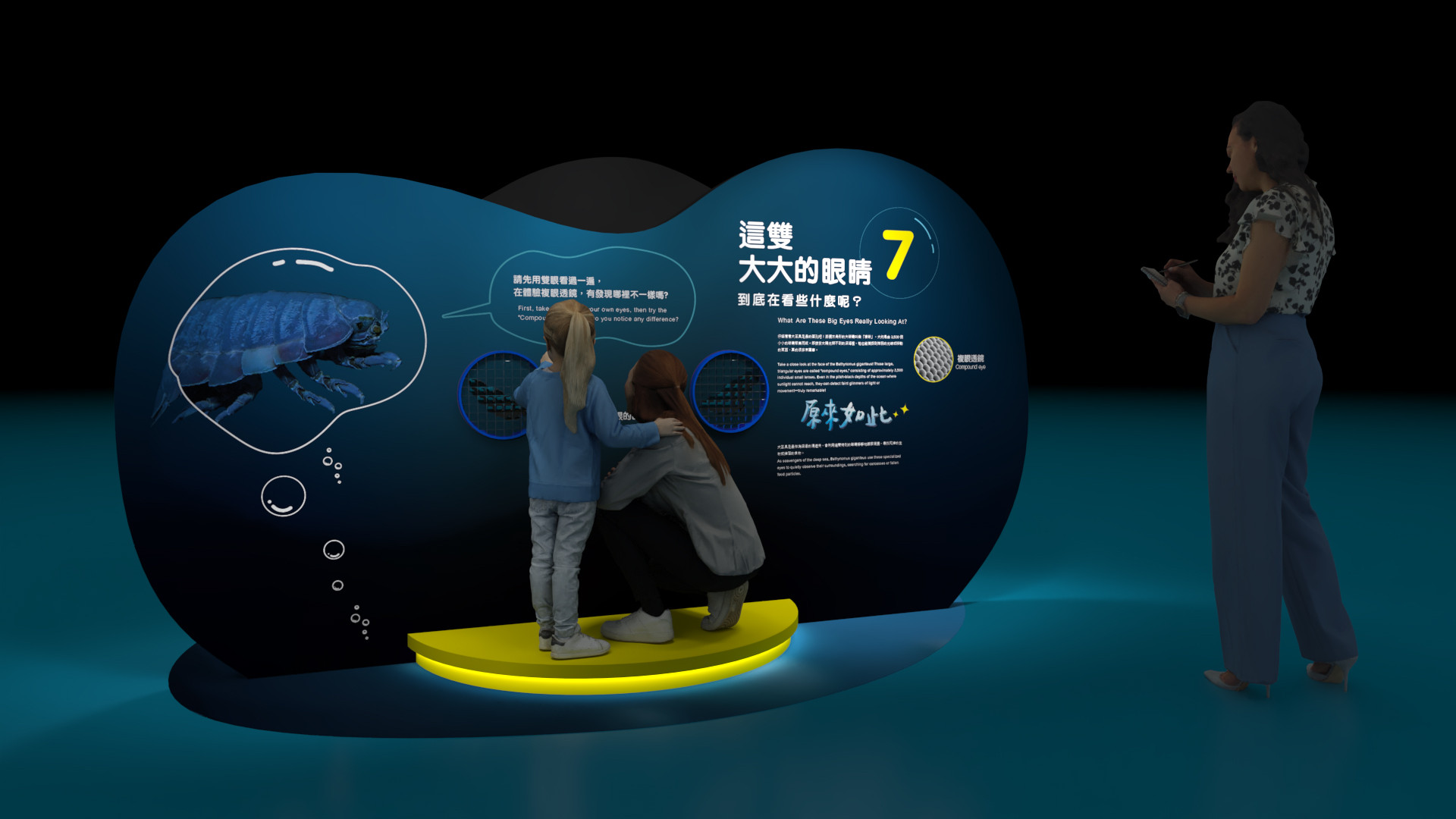 以及大王具足蟲的複眼如何在深海微光中感知環境。透過沉浸式展示與互動體驗,讓遊客在療癒的海洋氛圍中理解生物演化的智慧。